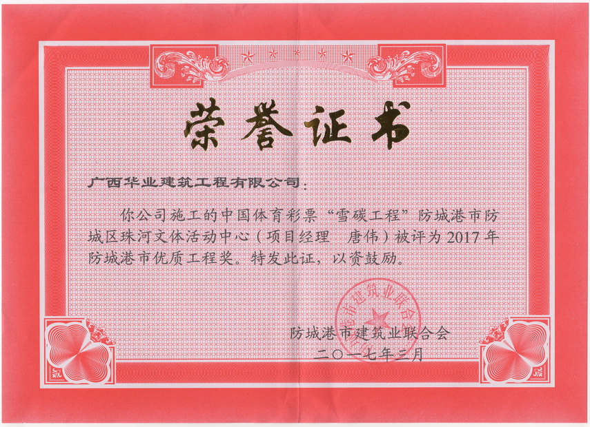 2017.12 东兴华美达广场(项目经理 龙叙强)被评为2017年防城港市优质工程..